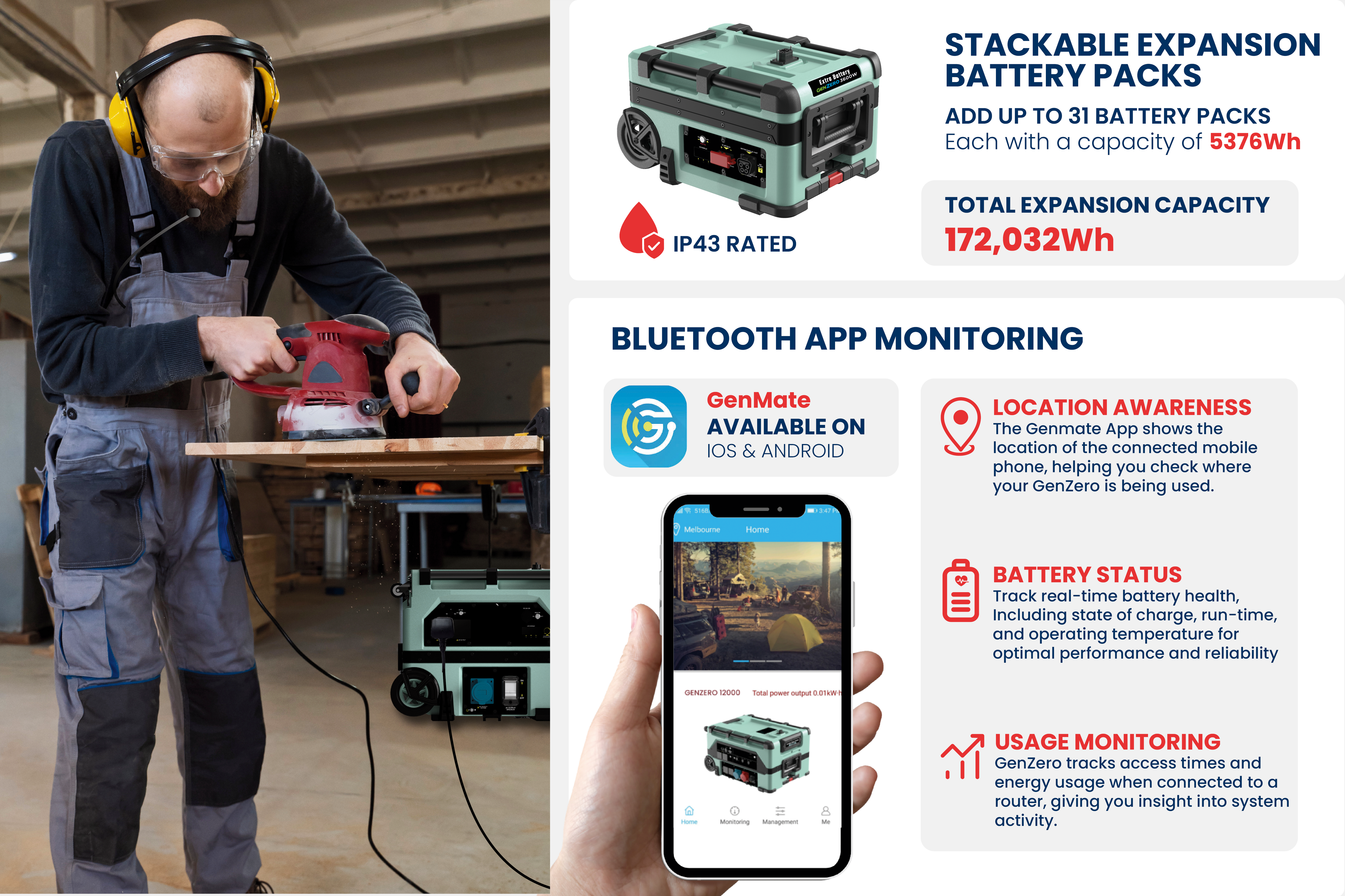 GenMate Bluetooth app connectivity provides live battery health monitoring, runtime tracking and usage analytics.